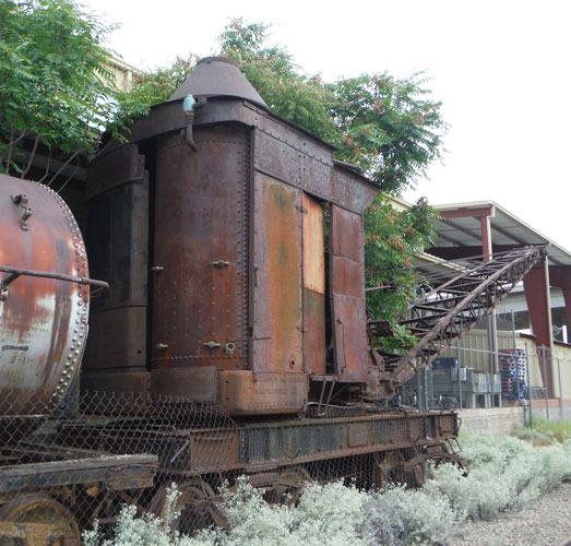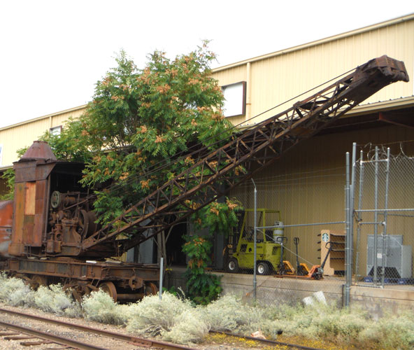 This interesting machine is parked on a siding at the north end of Globe. I do not know the crane's history, or who owns it. It is not a part of a museum display.The car appears to have been sitting on this siding for quite a while. At the time, all I could say about the car was that it was a crane of some kind.
