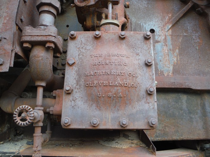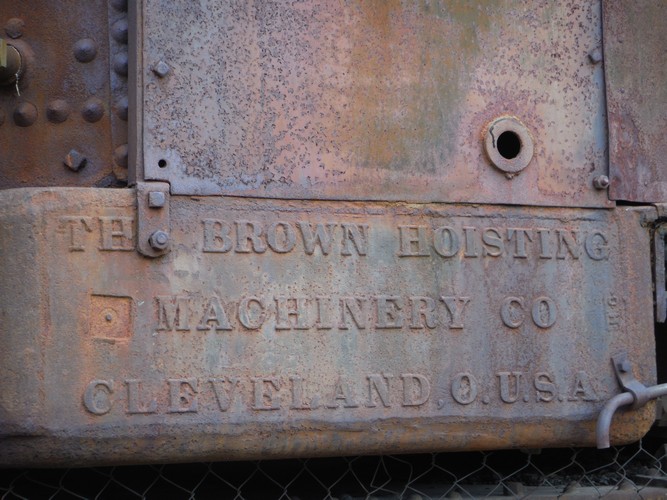 An online look-up of the company name revealed that "The Brown Hoisting Machinery Company" name was in use from 1900-1927. This photo is from a 1919 Brown Hoisting Machinery Company catalog. The crane in the catalog photo looks very similar to the car in Globe. A catalog reference stated that the car could be outfitted with either coal, wood, or oil as the fuel for the steam boiler.