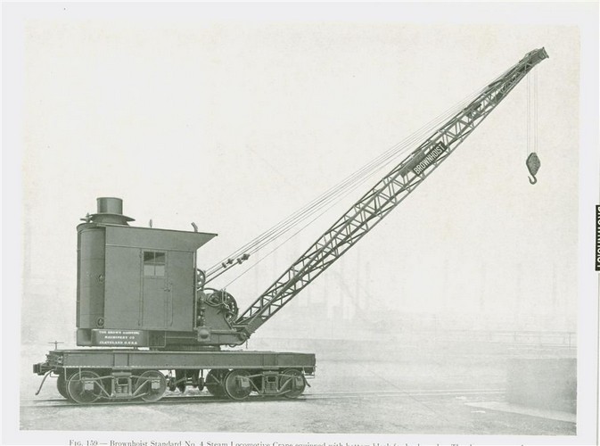The lifting machiney looked to be very complete. The vertical piston on the side of the hoisting machinery gave it away that this was a steam powered machine. The large can shaped structure at the rear of the cab had to be the boiler. The crane operator who worked next to that boiler must have been one tough guy.