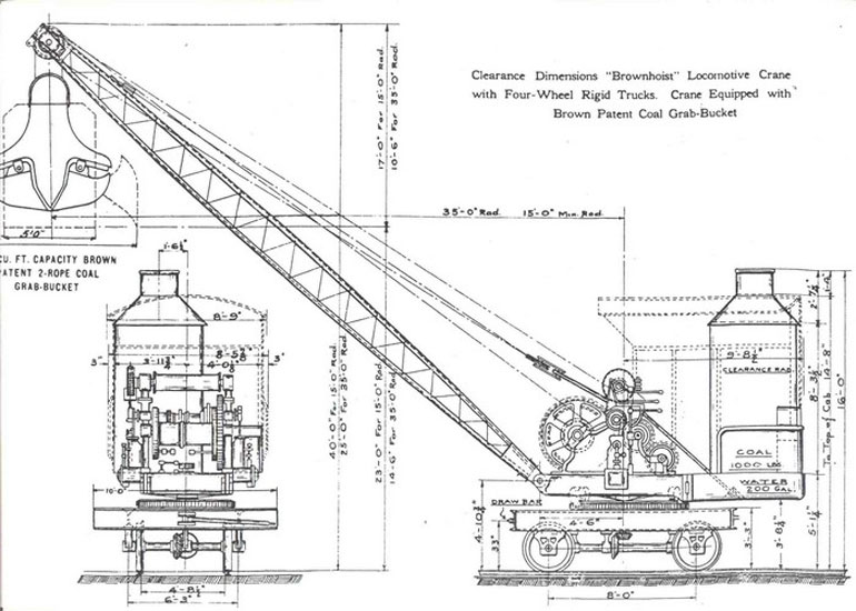 This working drawing of the locomotive crane shows that the machine was self-contained. There were on board provisions for water and coal for the boiler. The lifting capacity of the crane depended on the elevation of the boom. The more that the boom was raised, the heavier the load that could be lifted. This elevation was referred to as the "radius". The higher the boom, the smaller the radius. In this drawing, the radius was shown at 35'. The working radius for the car in Globe, with its 12000 pound counterweight, ranged from 12' and a lifting capacity of 31,500 pounds, to a radius of 39' and a lifting capacity of 7,200 pounds. I did not see outriggers on the car. My guess is that the lifting was done with an alignment as close as possible to the direction of the wheels.