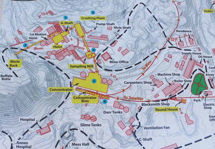What remains at the Old Dominion mine site is just a very tiny portion of what was there when the mine operation was operating at its peak. This map, which is on an interpretive sign along one of the trails, shows the development that was once at this location.