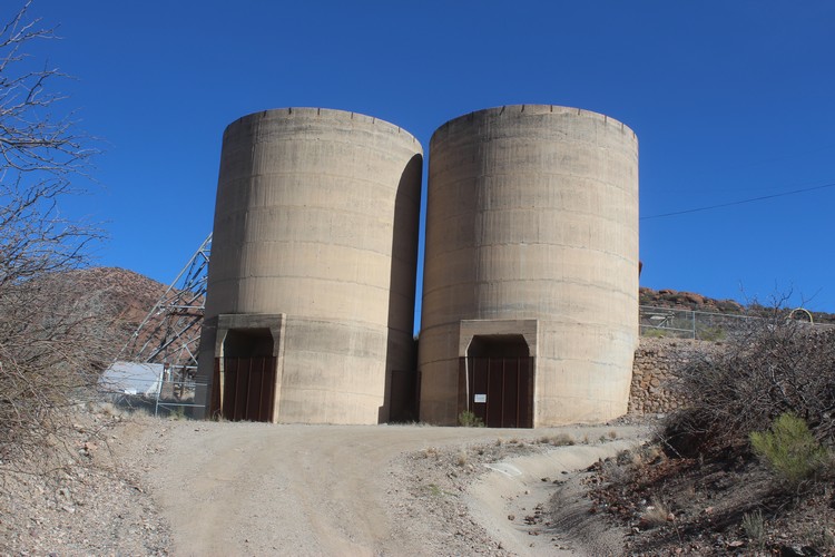 This is a view from the trail below the two slime tanks shown on the map above. A large part of the ore processing at the Old Dominion Mine occurred on the hillside beyond those tanks. The metal headframe is standing over the A-shaft where ore was raised to the surface. The two tall vertical concrete cylinders were a part of the sampling mill identified on the map. The row of concrete foundations between the slime tanks and the tall vertical bins of the sampling mill were the concentrate bins which held the processed ore that was ready to be transported to the smelter. Neither the concentrator building or the other buildings that were once nearby still stand.