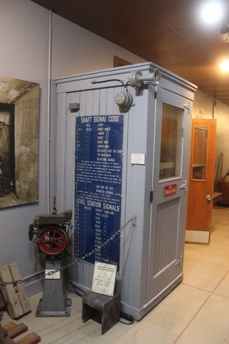 This telephone booth looking structure was just that, a telephone booth. It was sound proofed to a very high degree so that telephone calls could be made in a very noisy mine environment. Is that horn mounted on the upper corner of the booth the ringer for the phone?