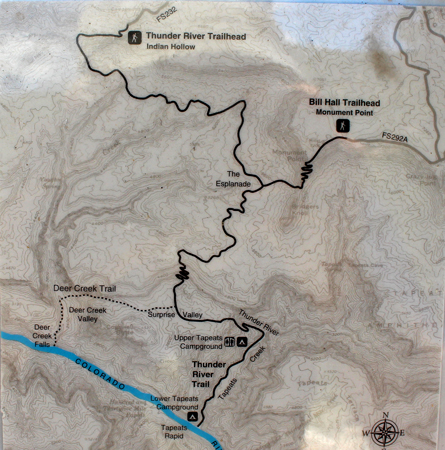 The upper part of the Thunder River trail is described as an old livestock trail. In approximately 5 miles, it merges with the Bill Hall Trail which comes off the rim to the east. The trail continues on past Thunder River, the world's shortest river. It ends on the banks of the Colorado River.