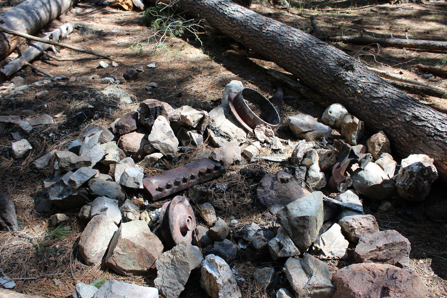 Old Iron tossed into a campfire ring includes a wheel for an ore car