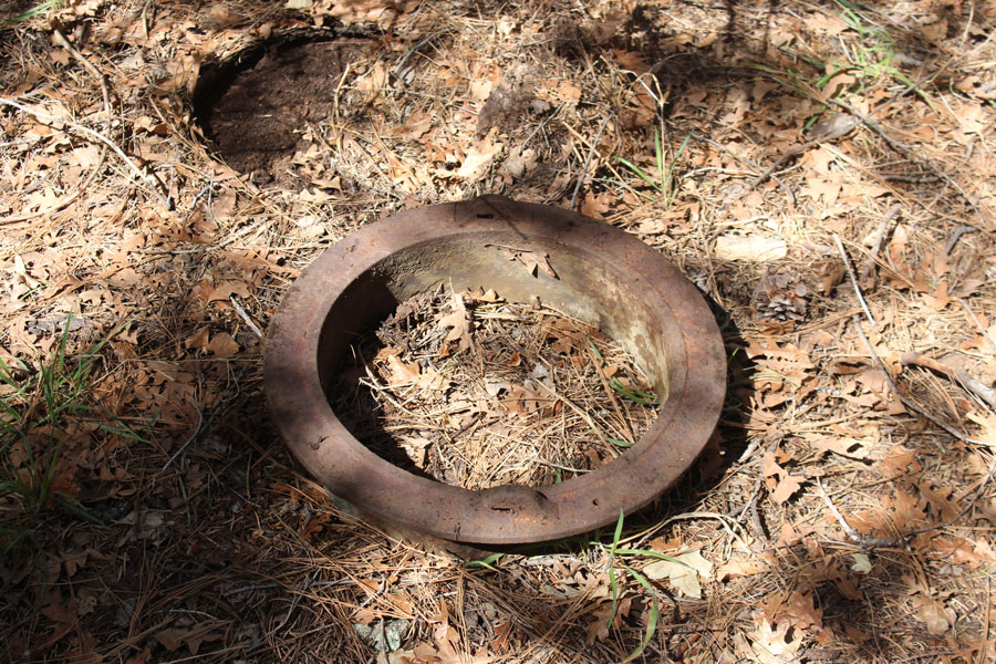 This unknown piece of iron may have been a collar of some type. Hooks on the side may have held a door? It is about 18" in diameter. We saw one of these at each of the two sites.