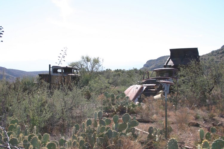 The truck on the left is WW II military. It may be an AutoCar. The truck on the right is a 50's era Ford.