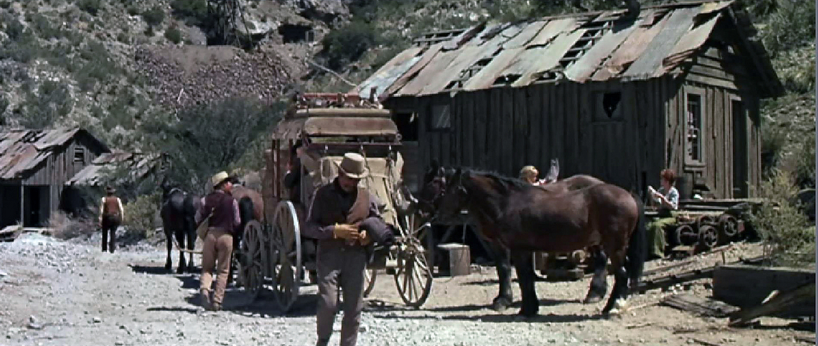 A screen shot from the movie Hombre that shows a close up view of several of the old shacks. There is a head frame just visible on the waste dump in the background.