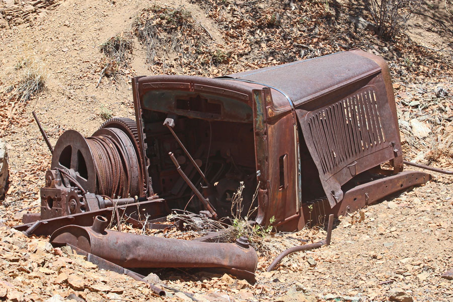 Old winding machine and automotive engine seen at the Ida Mine