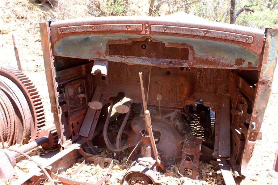 The dashboard, bellhousing and transmission of the car at the Ida Mine