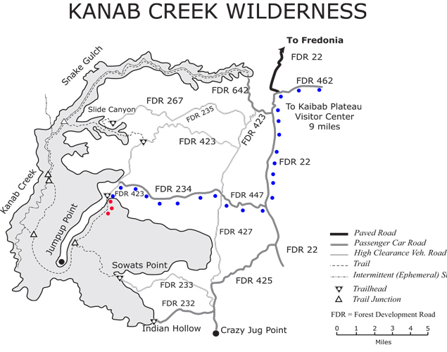 This map shows our route(blue dots). Our base camp was setup near Jacob Lake northeast of FDR 462. FDR 22 is appropriately labeled as a passenger car road and would probably remain that way through all but the worst conditions. I am not sure that I would agree with the labels on FDR 447 and FDR 234. I do not think that I would attempt those roads without having 4WD available if they were wet.