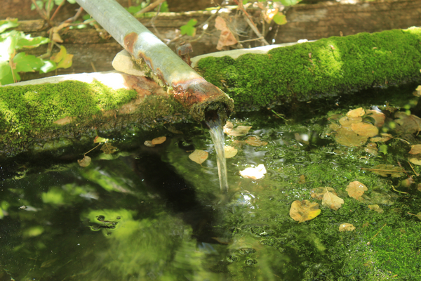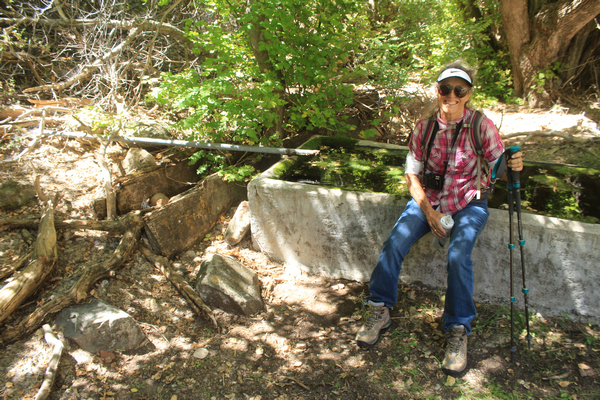 It was very shady and cool around the spring. Except for a bit of floating algae the water in the concrete trough was clear and cold. An older wooden trough lay to the side. The year 1933 was scratched in the concrete.