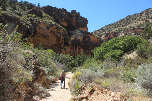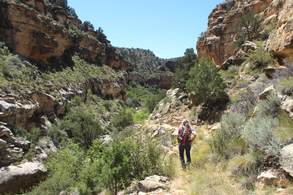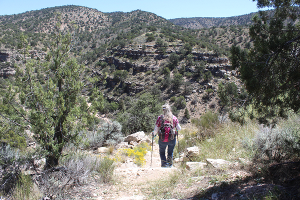 We decided to load up our day packs and take a short walk down into Jumpup Canyon. The upper Jumpup Spring was just 1/2 mile or so down the trail. Once on our way, we found the trail surface to be somewhat overgrown. There had not been a lot of recent traffic. That was not surprising. It was August--not a recommended time to be out on the trails at this location!
