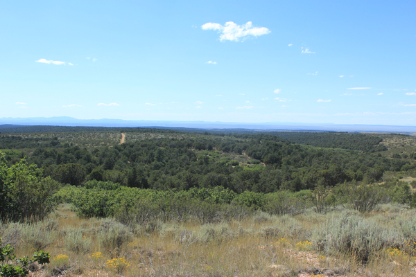 The FDR 447 and FDR234 legs of the route are through pretty empty and remote country. This is looking west from the 234 road. It can be seen continuing in the distance. The Kanab Creek Wilderness boundary is several miles beyond the green tree line. Most of the trees here are pinyon pine and juniper.