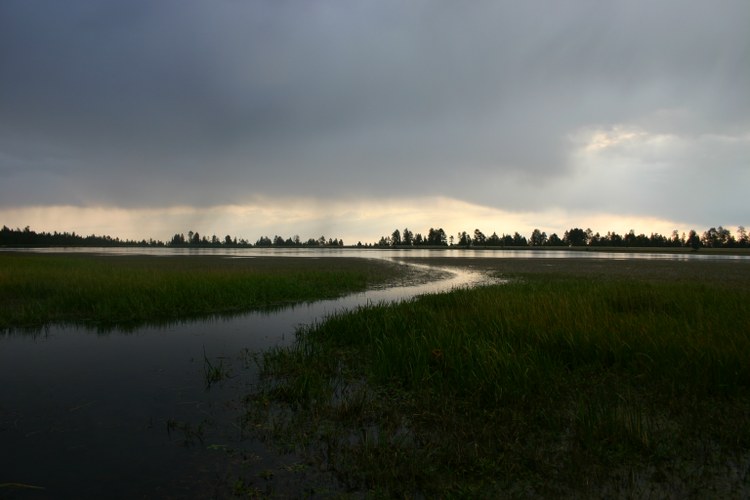 Carnero Lake at sunset. Tubers and ordinary boats had to use the channel. The kayak could glide through