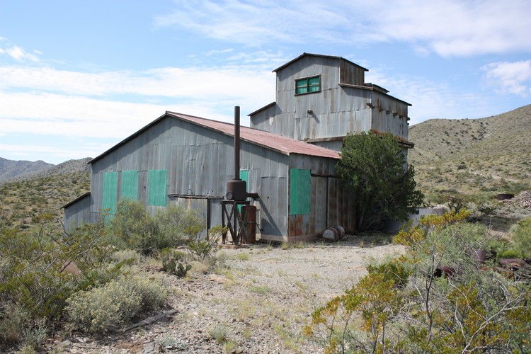 The vertical pipe is part of the exhaust system for a large engine inside the mill.