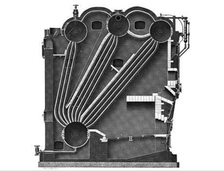 After I returned home, I happened to thumb through an old boiler manual and came across the illustration below. The illustration seems to be very similar to the style of boiler seen at the quarry. It is an example of a Stirling Boiler that used a stack of steam and water drums. Water circulated through nearly vertical tubes between the drums. Steam was pulled off from the top set. This style of boiler first appeared around 1890, and by 1900 were very popular. They were efficient but large in size. The boiler tubes however could not withstand very high pressure so the boilers were used in low pressure applications. This type of boiler was constructed with as few as 2 drums or as many as 5 drums.
