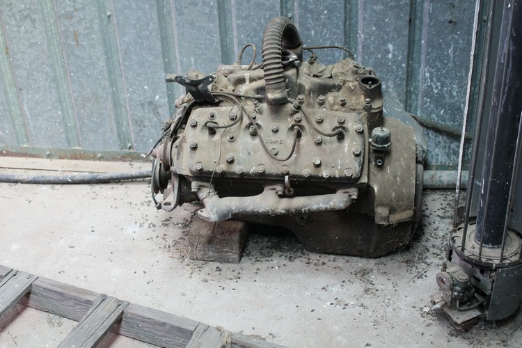Was this a spare engine for the winch? The heads on this flat head Ford engine are marked 59A-B. Produced in 1946-48. Notice bellhousing is part of block.