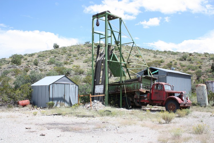 Ore appears to have been dumped into a skip outside the headframe then lifted and dumped into the trucks. Ore must have been brought to the area by tractor. There is no shaft at the base of the headframe.