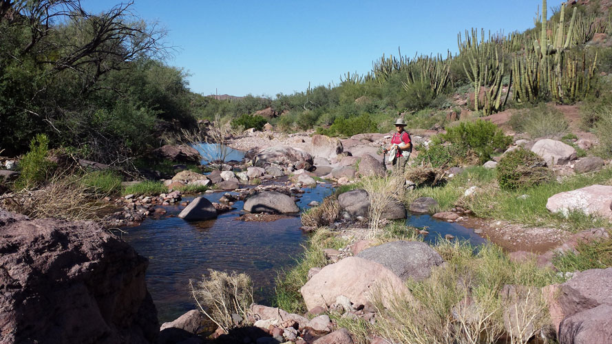 Our plan had been to walk aways up the canyon beyond the old corral, but a large gathering of bees and wasps in several of the bushes along the way made us think twice about continuing. The creekside had been so pleasant that instead of walking the old road back to the trailhead, we made our way along the wash.