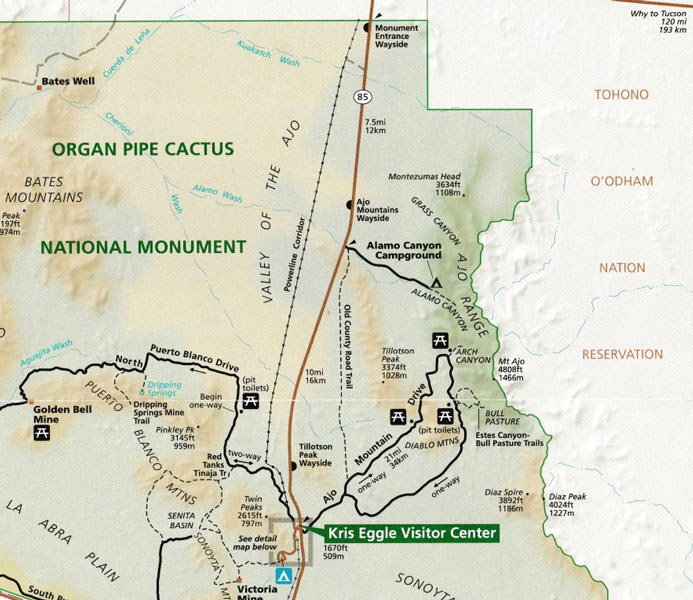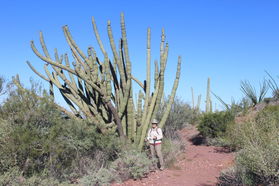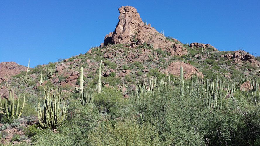 While on a road trip to check out the town of Ajo, a ranger at the Cabeza Prieta Refuge Visitor Center mentioned that one of his favorite hikes in the area was in Organ Pipe National Monument at a location called Alamo Canyon. The ranger said that the canyon was particularly scenic and a walk there could be extended up one of the three forks that come together not too far above the ruins of an old ranch house.