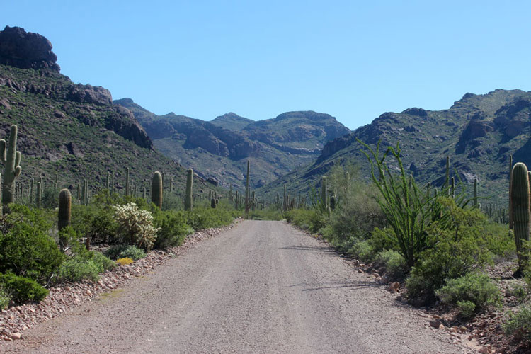 This is the view up into Alamo Canyon from the Alamo Canyon Road. The mountains are a part of the Ajo Range. The ridgeline in the distance marks the boundary between Organ Pipe and the Tohono O'odham reservation. Alamo Campground is at the mouth of the canyon. The desert plants here are spectacular.