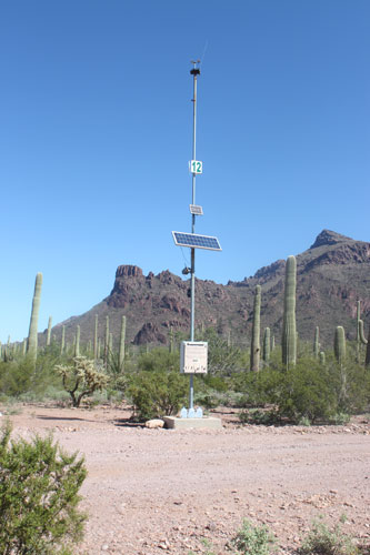 This is an emergency rescue beacon located along the Alamo road that was installed for persons who find themselves in an emergency situation. A powerful blue light shines at night to mark the location of the beacon. When we were here a "youth" group, was setting out the jugs of water seen at the base of the beacon. The group later walked up into the canyon with many other jugs of water and backpacks filled with food to be set out on one or more of the "trails". I am not sure that their activity was actually legal or permitted....