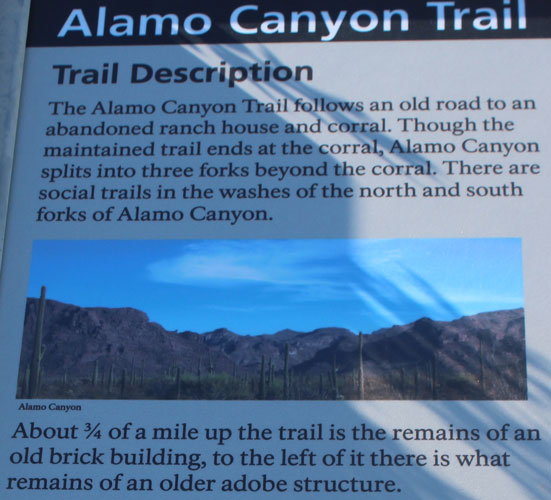 There are quite a few specimens of the Monument's namesake cactus along the Alamo trail and the hillsides nearby. What are missing are the "Alamos", the canyon's namesake plant. Alamo is the Spanish word used for cottonwood tree. There are very few, if any, of these trees. to be seen in the canyon.