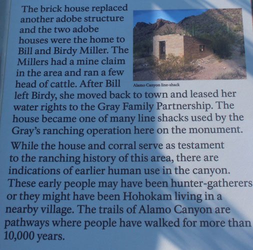 This is a summary of the history of the canyon as noted on the Park Service sign. There is no reference to the acrimony that existed between the Gray Family Partnership and the National Park Service. Because of an effective lawyer, and an ally in the form of a very powerful U.S. Senator by the name of Carl Hayden, the Gray family was able to wrangle lifetime grazing permits on the Monument. With those in hand, the family was able to treat Organ Pipe National Monument as their personal kingdom for more than 40 years. Over that time period, the family did pretty much what they wanted when they wanted . The issues only came to an end with the death of several of the Gray sons in the 1970s. A final roundup of Gray cattle conducted by the Park Service removed over 1700 cows from the monument. This was in spite of the fact that the Gray Family had lost their "lifetime" permits several years before the sons' deaths....