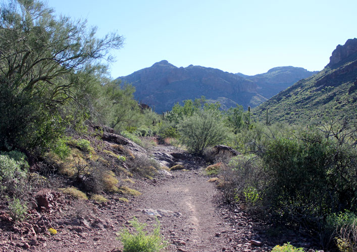 Up in the canyon, the old roadway narrows to a single track that runs above the bed of Alamo Wash.