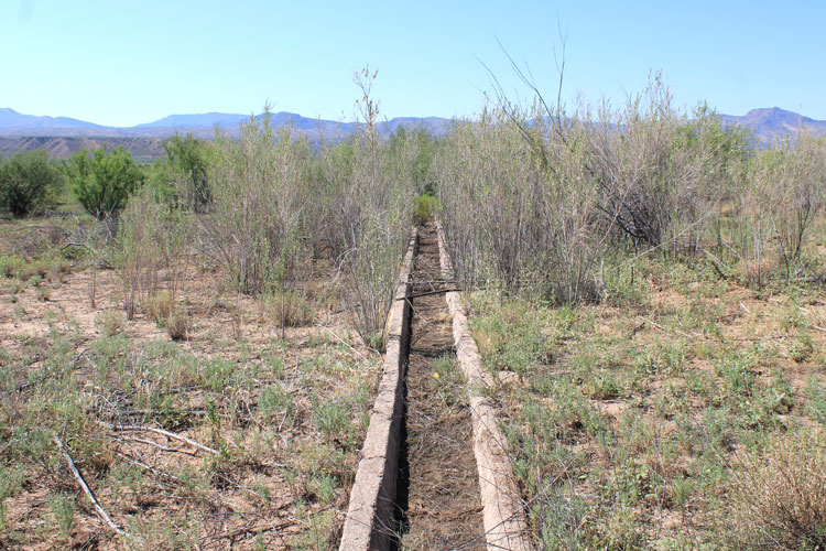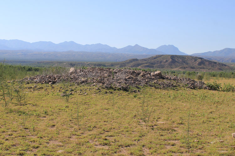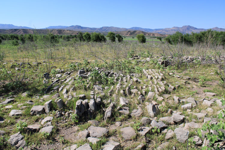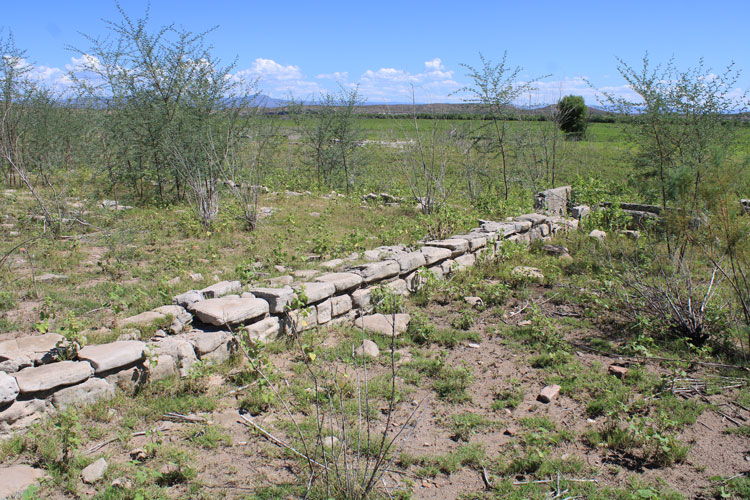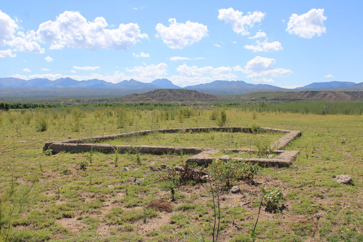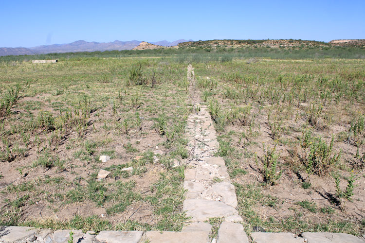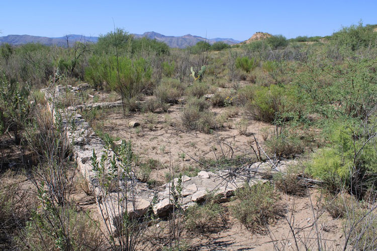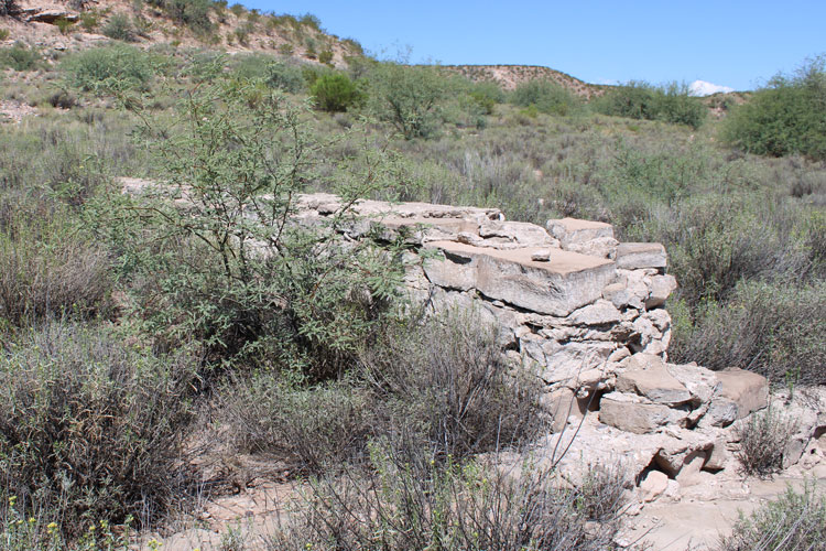 This is one of the foundations of the officers' quarters. These foundations were easier to spot in Google Earth than they were at ground level. The foundations were constructed of quarried stones grouted with cement. Approximately 10 of these foundations remain. When the San Carlos Agency was abandoned, the buildings were dismantled and their materials were re-used elsewhere.