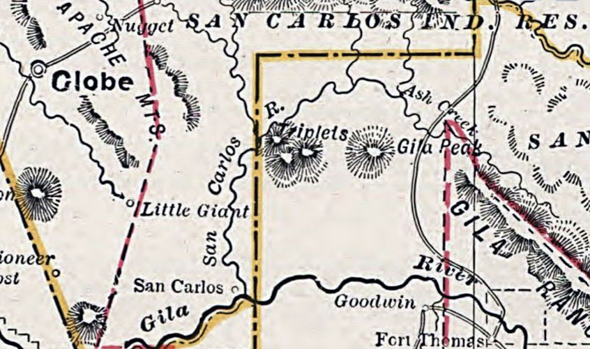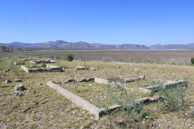 Old San Carlos is the site of the original Indian agency and a military post that were established on the San Carlos Apache Reservation in the 1870s. The agency was located on a low bench near the confluence of the San Carlos River and the Gila River approximately 35 miles southeast of Globe. The site was abandoned in 1929, and was soon flooded by the rising waters of the newly created San Carlos Reservoir in the 1930s. When the lake levels are low, the foundations of the old agency and army post are exposed and are interesting to visit.