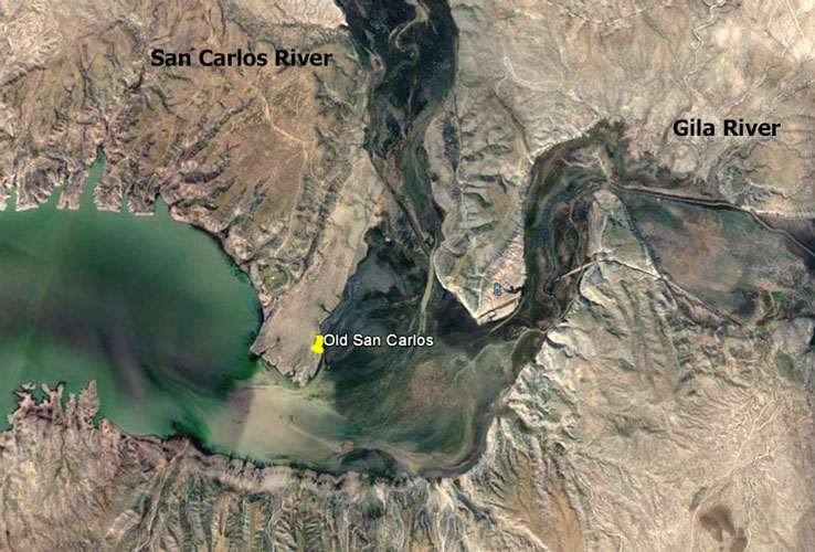 When it became evident that the San Carlos site would be affected by the construction of Coolidge Dam on the Gila River, a new administrative site was established at the community of Rice several miles upstream on the San Carlos River. In 1931, the name of Rice was changed to San Carlos. The original San Carlos then became known as "Old San Carlos." This was the Google Earth view of the site in 2016.