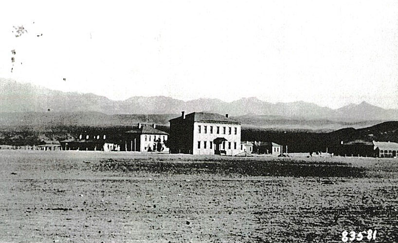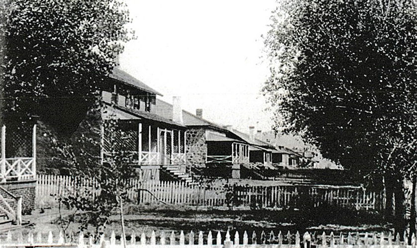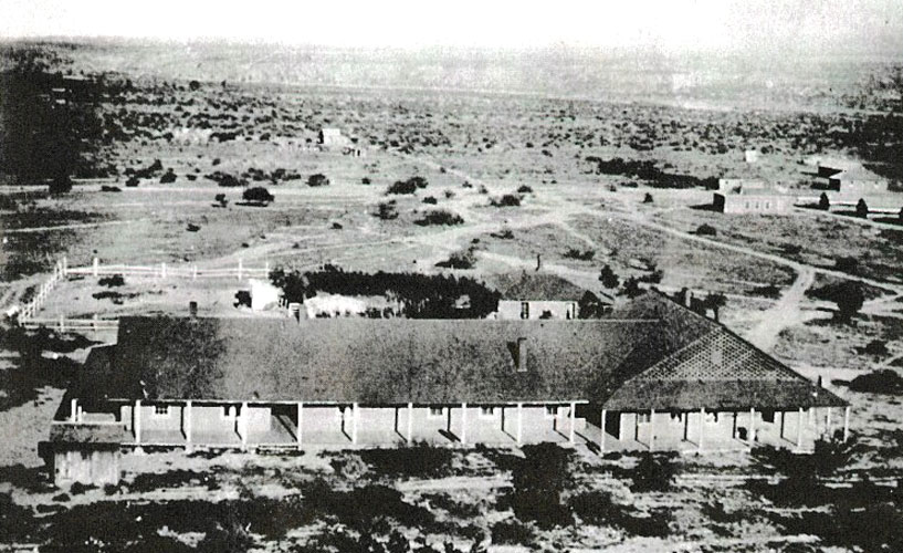 North of the Officers' quarters was the Post hospital. This was its appearance in 1895. After the military camp was abandoned, the building served as a hotel, and was then re-established as a hospital for the Apaches.
