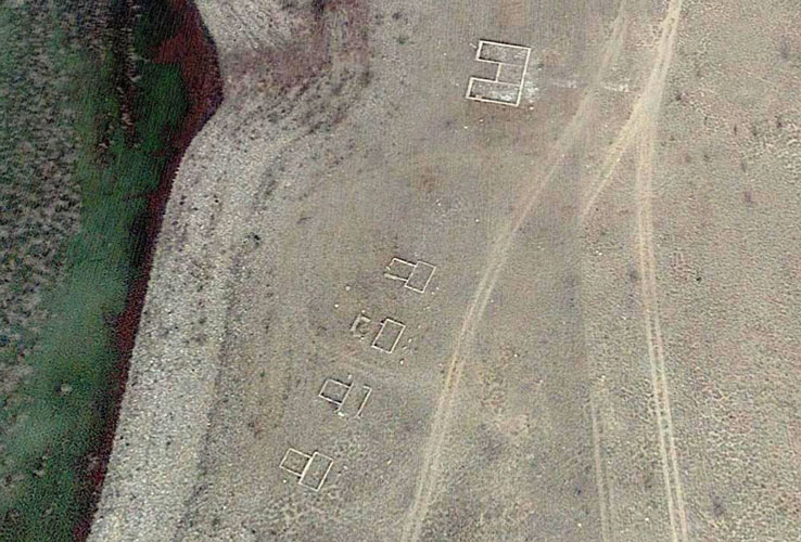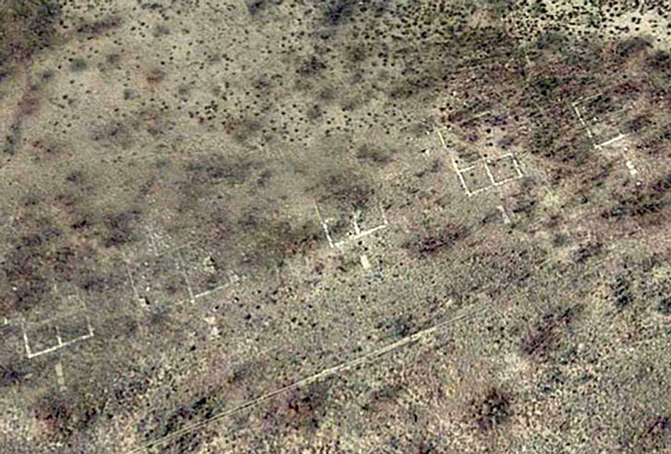 The outlines of the buildings in this Google Earth view are the foundations of several buildings that made up "Officers' Row" at Camp San Carlos, the military post that shared space with the Indian Agency. The permanent buildings that were constructed here in the 1890s replaced the tents formerly occupied by the army officers. Originally, there were 12 of these officers' quarters.