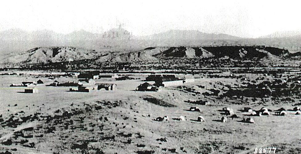 In 1895, this was the view of the Indian Agency. The Gila River was in the distance. Apache encampments can be seen to the right side of the photo.