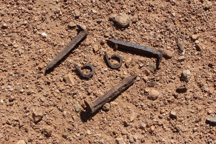 Rail spikes seen along the SP roadbed. I do not know what the curled pieces are. Are they some type of lock washer?
