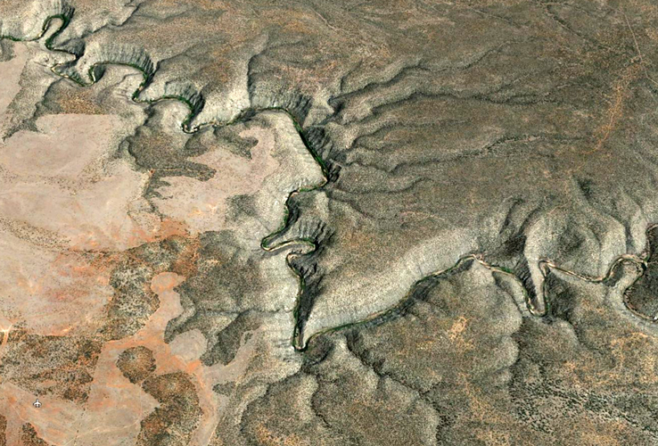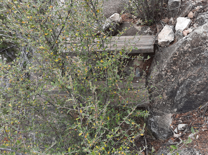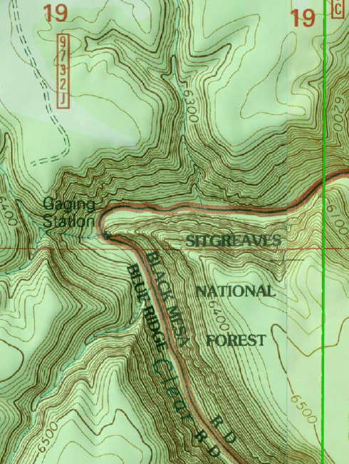 At the trailhead for the stream gage trail, this is the view down into Clear Creek. The sharp bend in the creek is visible in the Google Earth view of the canyon that appears at the top of this report. The stream gage was apparently in operation from the 1940s through at least the 1990s. In USGS reporting, the station was described as being located at: "Clear Creek below Willow Creek". It was designated as station: 09398500,