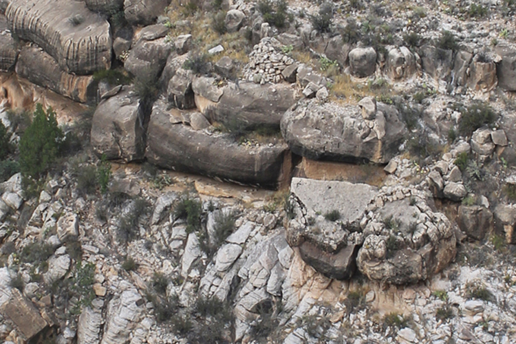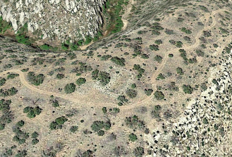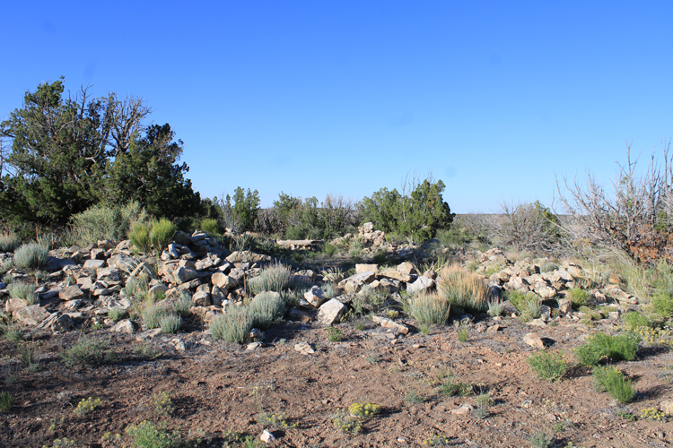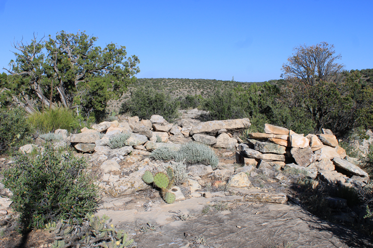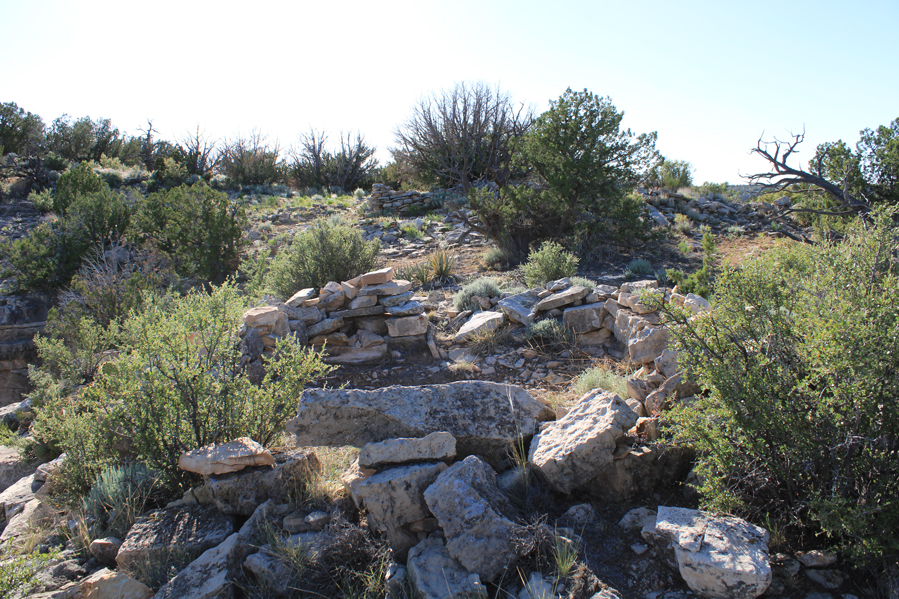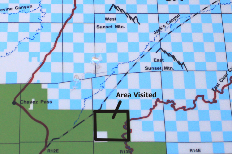 A Google Earth flyover prior to the trip revealed several rock walls northeast of Red Hill. Before making our way south to the gaging station trailhead, we diverted over to the rim to check these out. The road in this image is not open to vehicular travel. The walk from the nearest open road was approximately one mile.