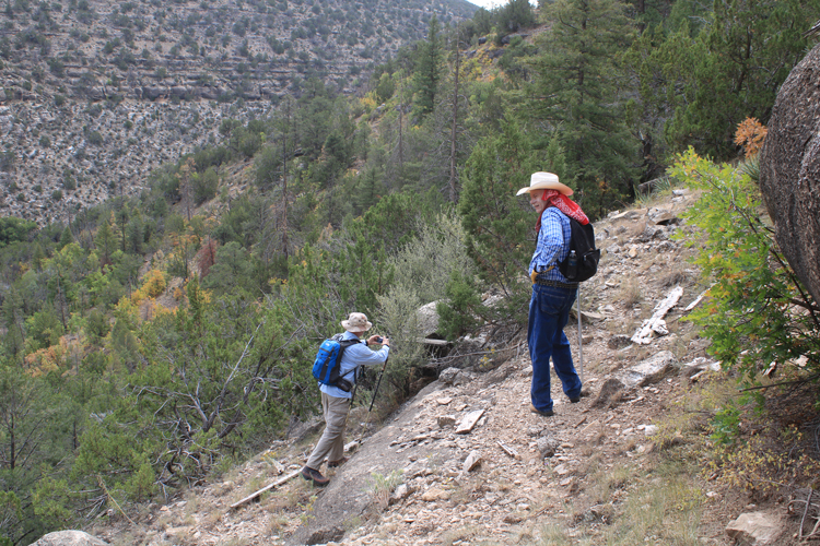 While at the cliff top ruins, we happened to notice an unnatural looking "zigzag" line on the opposite canyon wall. Through binoculars, it could be seen that this was a constructed trail that was obviously quite old. Our speculation is that the trail is newer than the ruins. Perhaps, it was created to provide access to the creek for the sheep that were being raised on the rim during the early 1900s.