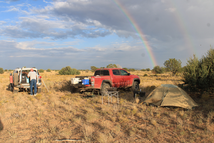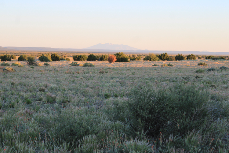 The vegetation near Red Hill is primarily open grassland with scattered stands of pinyon pine and juniper trees. Elevations are in the 6000' range. In this image, the San Francisco Peaks near Flagstaff are in view.