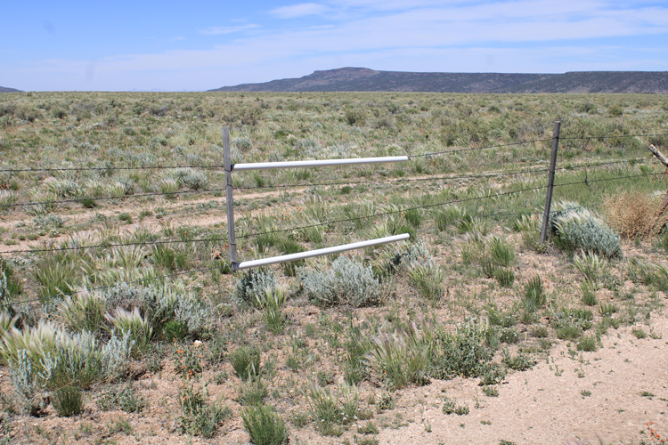 Lengths of PVC pipe strung on fence wires provide a way for deer, elk, and pronghorn to cross. Apparently, the deer and elk are able to jump the fence, while the pronghorn crawl under.