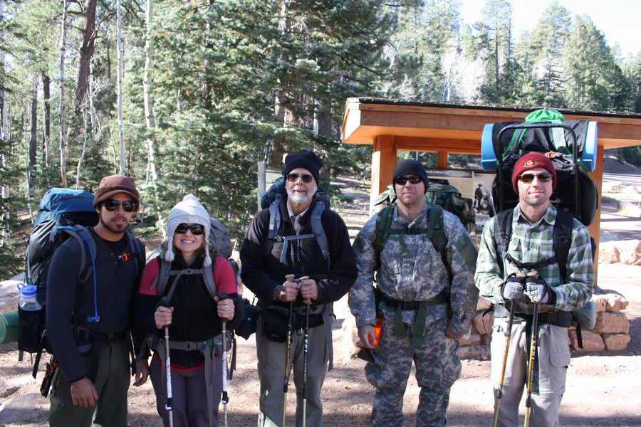 This is our "before" the hike photo taken at the North Kaibab Trailhead. Temps were in the 30's when we started.
