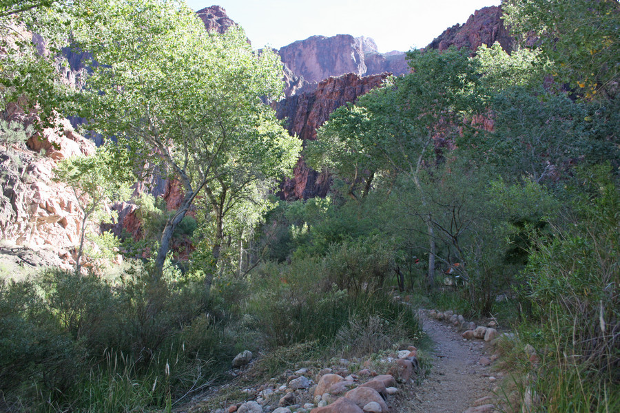 The campsites of Bright Angel Campground are under the trees alongside this path.