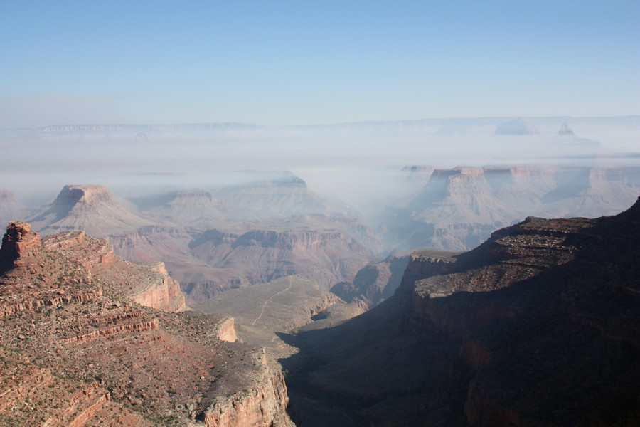 Smoke is really settling down into the canyons. We were very fortunate that we did not have to hike through that. The trail from Indian Garden out to Plateau Point can be seen in the lower center part of the photo.
