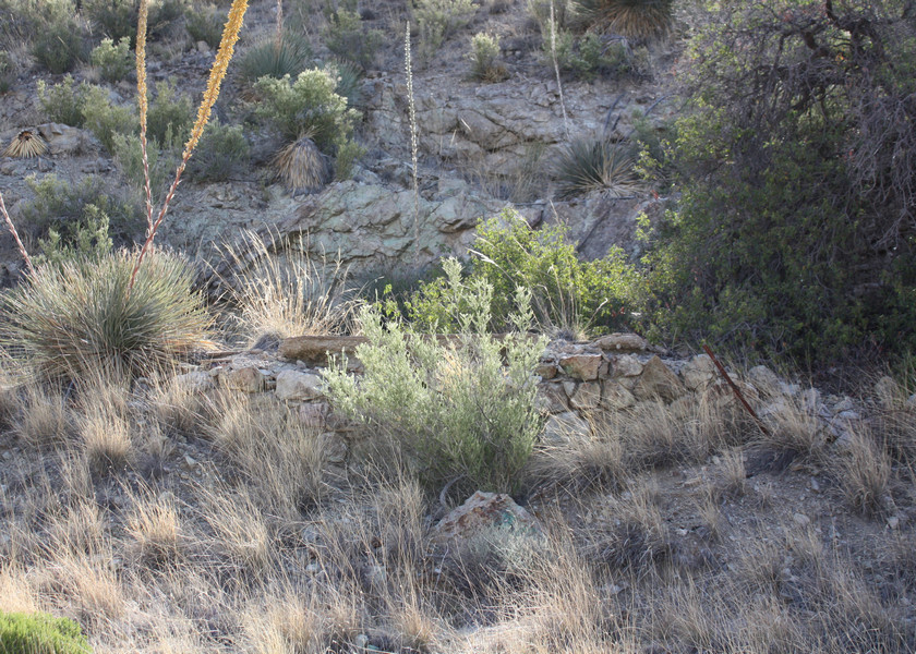 Rock retaining wall and concrete floor that was part of the Hoist House seen in the center of the 1909 photo. Large anchor bolts for the machinery still extend from the concrete.