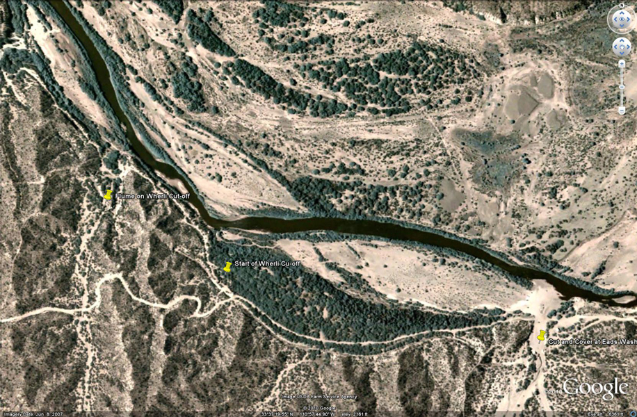 The co-ordinates for the upstream side of the Wherli Cut-off are: N 33° 37' 12.91" W110° 57' 52.38"