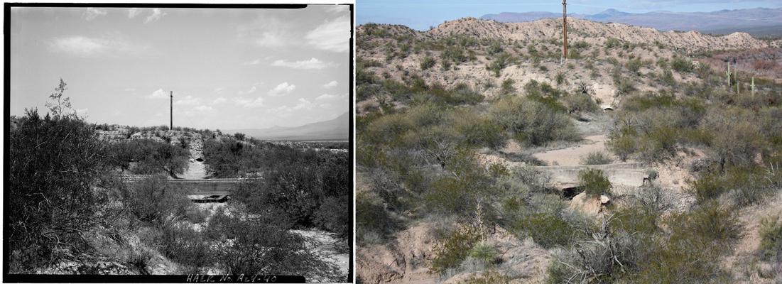 View downstream of Stucture 2E, a concrete drainage flume crossing the canal and structure 2F, a 129' tunnel. These structures are located on the Wherli Cut-off. The photo on the left was taken in 1984 and the one on the right in 2011.