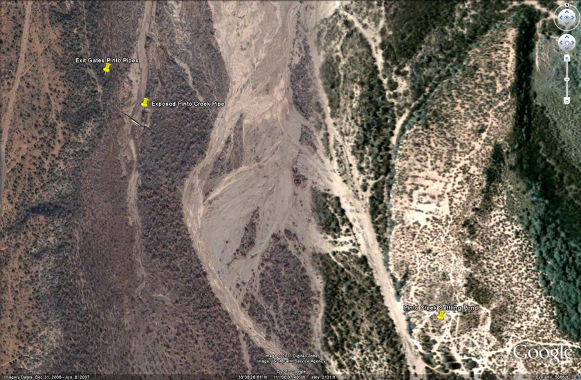 Google Earth View of the Pinto Creek Settling Pond, the exposed Pinto pipes and the Exit Gates