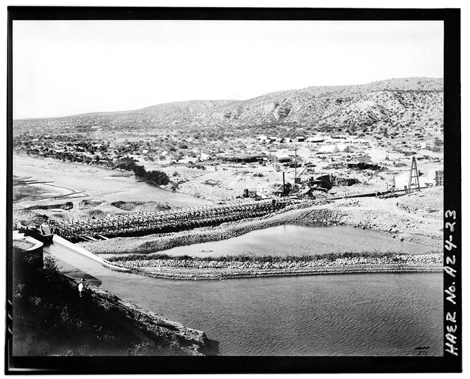 This photo taken from the south abutment looking north shows a temporary dam in place diverting water away from the dam site. This photo was taken in September of 1906. The dam was completed two months later.